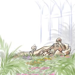 サクラ姫が鉢植えを抱えて戻ると、兄王は人差し指を唇に当てて見せました。美しい四阿には急ごしらえの帳が巡らされ、その中で、王は寝椅子に腰を下ろし、膝に神官様を休ませています。 足音を忍ばせて、サクラ姫は神官様の寝顔をのぞきこみました。長いまつげの白い顔は、このところの心労で、うっすらとやつれて見えます。 「連日、大変だったからな…。」 「兄様も。大丈夫?」 「オレか…?」 王は笑って、神官様の髪をそっと撫でました。 「雪兎がいるからな。」 「うん。 雪兎さん、早く元気になって下さいね。」 花の香りの四阿に温かな風が吹きます。 「鈴音草」end |